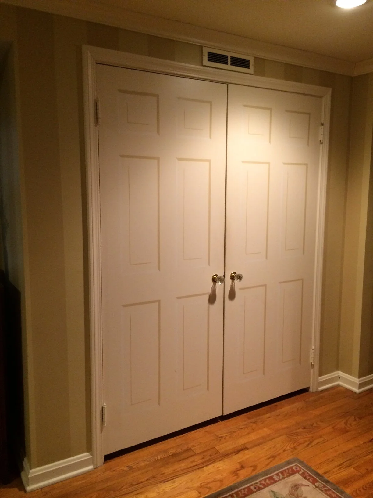 Such was the case in a client’s home in Shaker Heights. We were redecorating the master bedroom when it became evident that the problem could not be ignored. On one long wall there were two large closets, each of which had two very plain hollow-core doors. As we focused our attention on the other surfaces in the room - lighting and soft color for the ceiling, a new rug on the hardwood floor, and tone-on-tone stripes for the walls - the plain doors became an eyesore in the space. The doors functioned well but they would have looked so much better if they had some kind of texture, such as paneling.